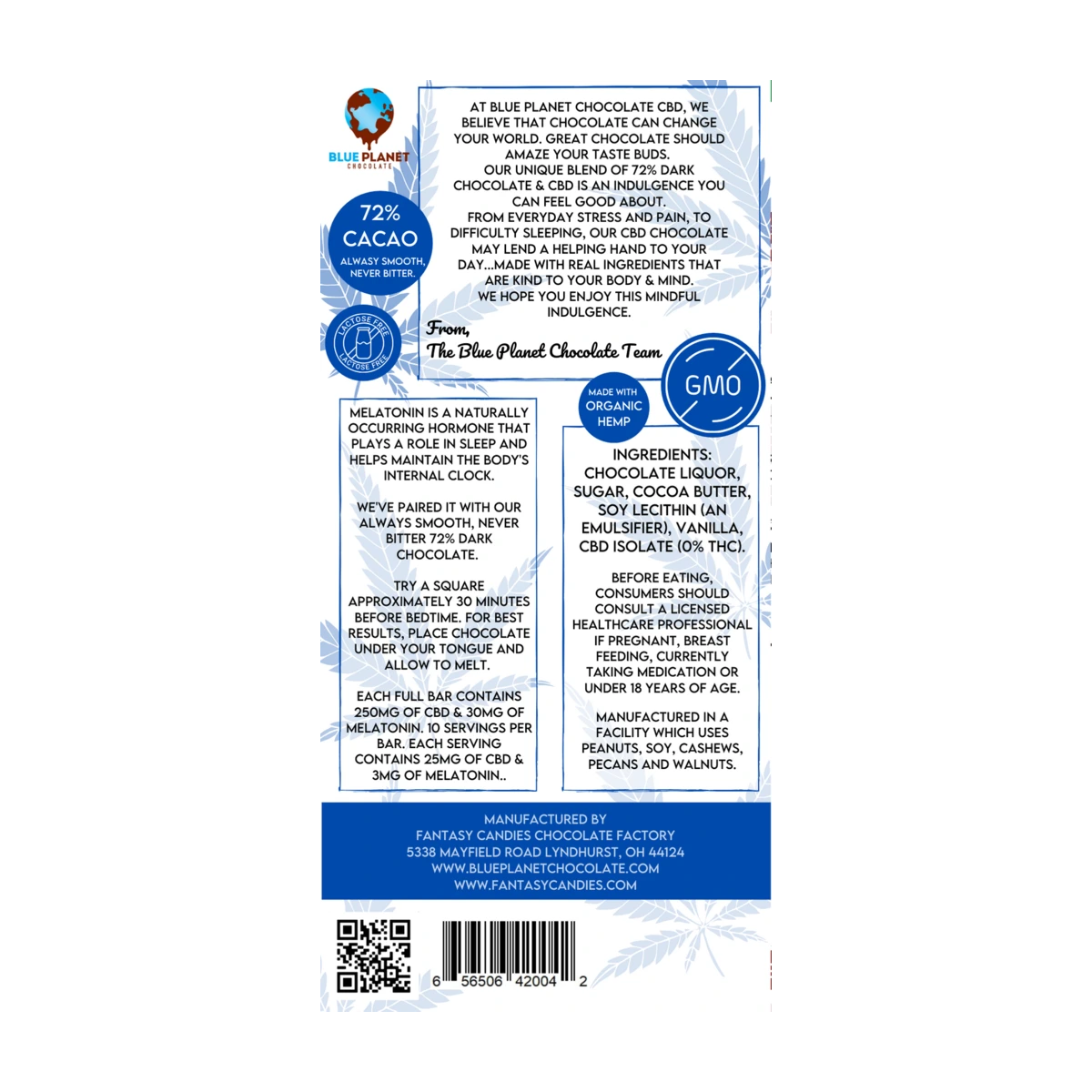 Made with our 72% dark chocolate, we have added Melatonin to our 250mg CBD bar. Melatonin, being a naturally occurring hormone, plays a role in sleep and helps maintain the body’s internal clock. Paired with our smooth dark chocolate and CBD, we suggest placing a piece under your tongue about 30 minutes before bedtime. If too much caffeine in dark chocolate is a concern, there is approximately 1mg of caffeine per square. So relax and enjoy a decadent piece of chocolate before bed.