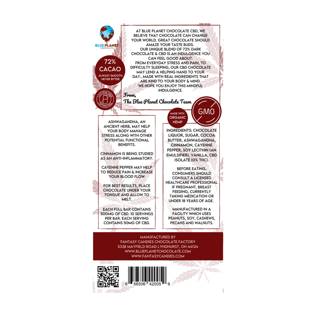 After a good workout, whether in the gym, the yard or a long day at work, your body can be achy from inflamed muscles. The combination of our 72% dark chocolate and CBD, with their antioxidant properties, along with Ashwagandha, Cinnamon, and Cayenne Pepper make for a delicious way to assist in your cool down. Each spicy dark chocolate square contains 50mg of CBD Isolate.