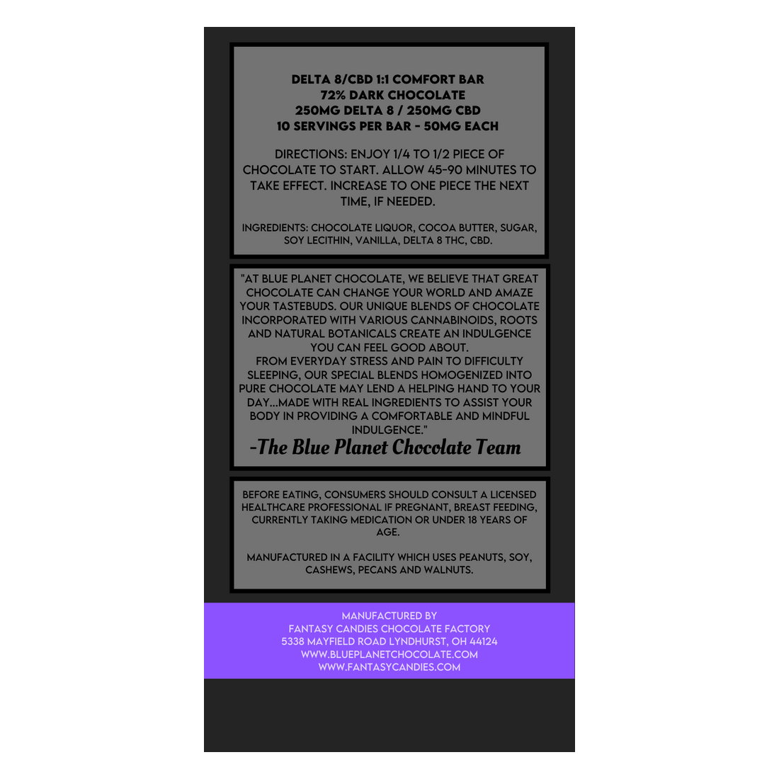 Delta-8 THC, which may have an intoxicating effect, is countered by adding CBD. The addition of CBD reduces any psychotropic from the Delta-8 THC, and makes the Comfort Bar perfect for those who prefer not to get “high”, but more of a body comfort.