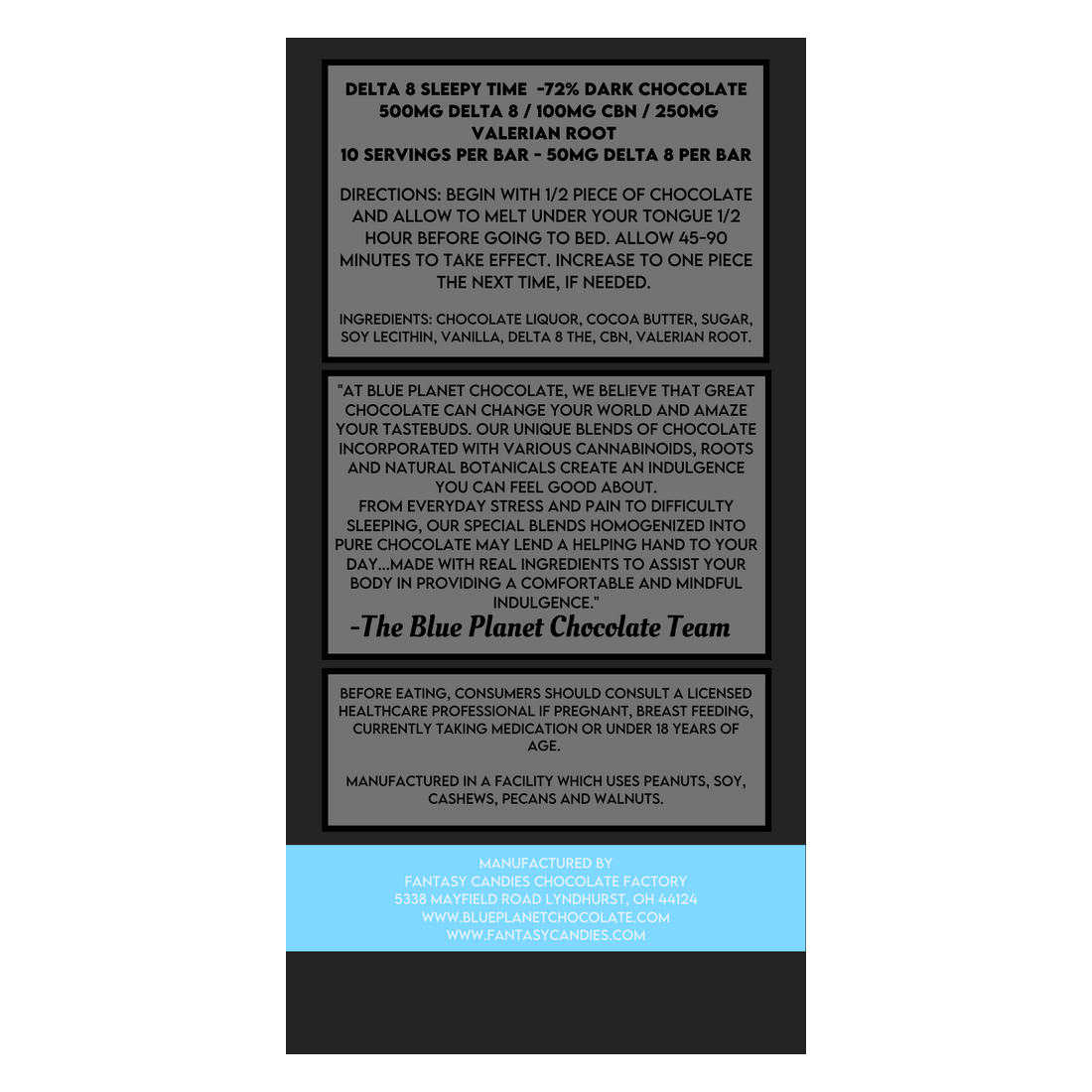 The Sleepy Time Bar is designed to address the needs of those who have difficulty sleeping. Whether you are having trouble falling asleep, or more commonly staying asleep, the Blue Planet Chocolate Delta-8 Sleepy Time Bar has achieved many successes and may be a game changer when it comes to a good nights sleep and feeling refreshed in the morning.